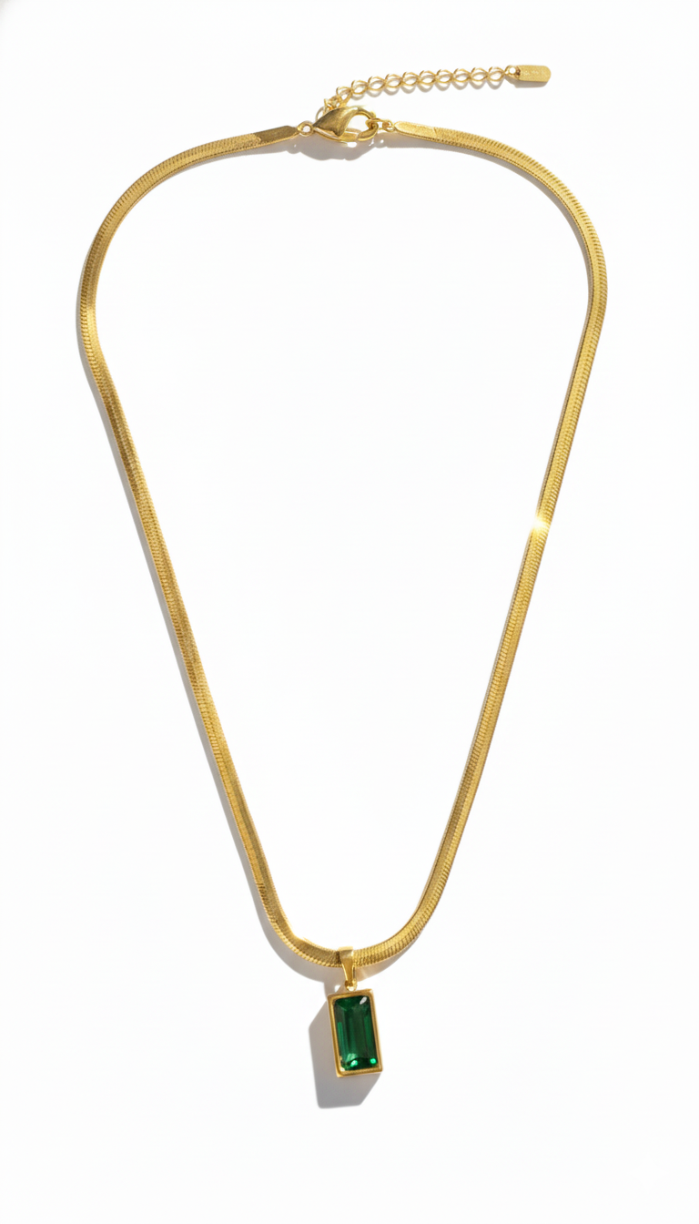 A sleek gold chain paired with an emerald-cut green gemstone pendant, crafted for understated elegance. Lightweight and timeless, this piece adds a refined pop of colour—perfect for everyday wear or effortless layering.